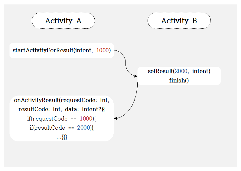 액티비티 A에서 B로 넘어갈 때에 requestCode 1000을 함께 발생시킨다.
